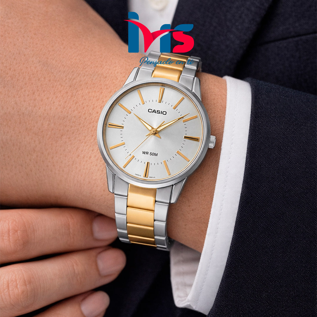 El Casio MTP-1303SG-7AV es un reloj masculino de diseño clásico y elegante, ideal para el uso diario y ocasiones formales. Su caja robusta con acabado ion plateado, combinada con una correa de acero inoxidable bicolor, ofrece un estilo sofisticado y duradero.