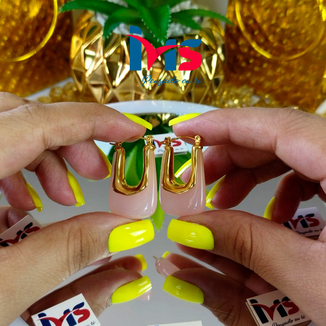 Estos aretes presentan un diseño moderno y sofisticado, combinando una estructura dorada tipo aro en forma de “U” con un elegante cuerpo inferior en tono rosa translúcido, que aporta un look femenino, delicado y actual. Su acabado brillante y su forma geométrica los convierten en una pieza protagonista que eleva cualquier outfit.
