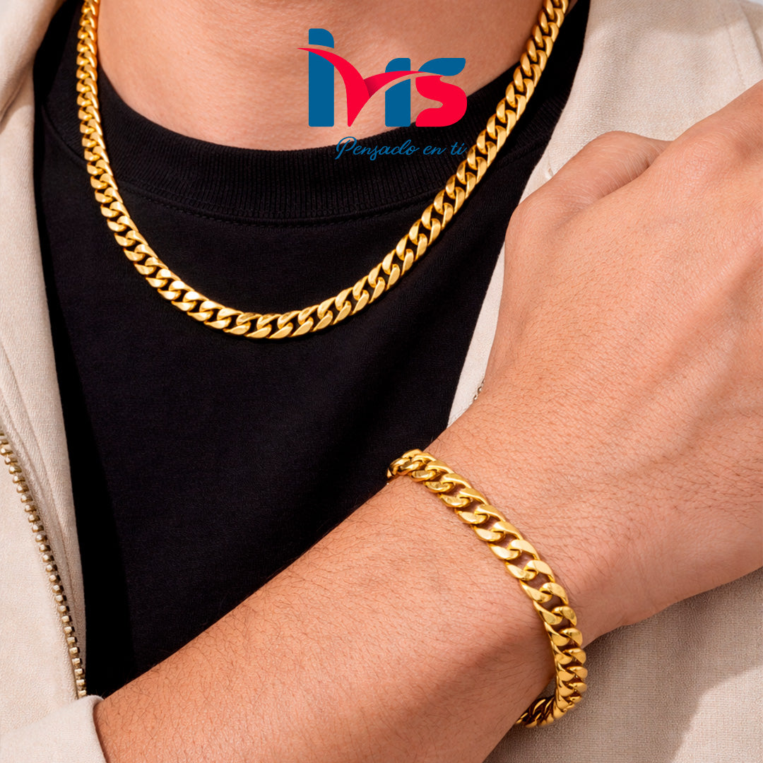 Elegante set de cadena y pulsera tipo cubana, elaborado en acero inoxidable 304 de alta calidad con acabado dorado brillante. Su diseño clásico y atemporal destaca por sus eslabones firmes y pulidos, aportando un estilo moderno, sofisticado y versátil para cualquier ocasión.